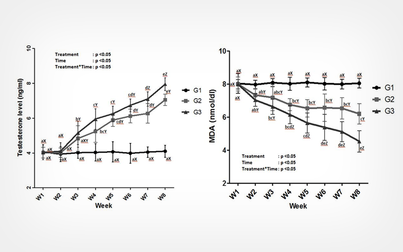 Fresh and post-thaw semen quality parameters were significantly (p <0.05) higher in G3 in comparison with G2 and G1, respectively. Also, testosterone level was significantly (p <0.05) increased at the 3rd week (W3) in the G2 and G3 groups in comparison with control group. Fertility and kidding rates were significantly (p <0.05) higher in does who were mated with bucks of G3.